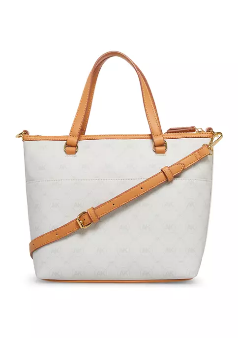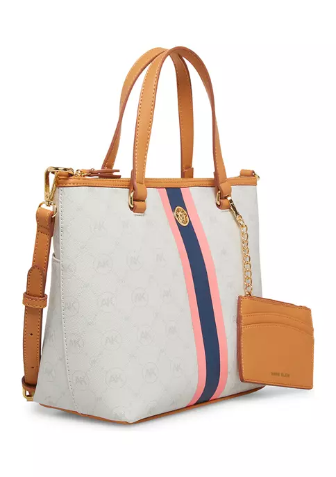 This chic tote from Anne Klein features the new AK ring logo design. It comes with a removable card case as well as a convertible crossbody strap that measures a max length of 24 inches.