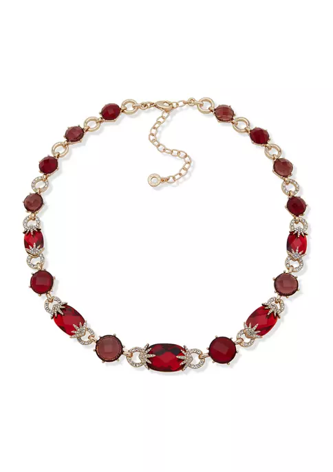 Finely detailed gold-tone metal and cranberry red stones garnish this collar-length necklace by Anne Klein.