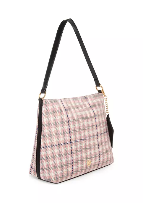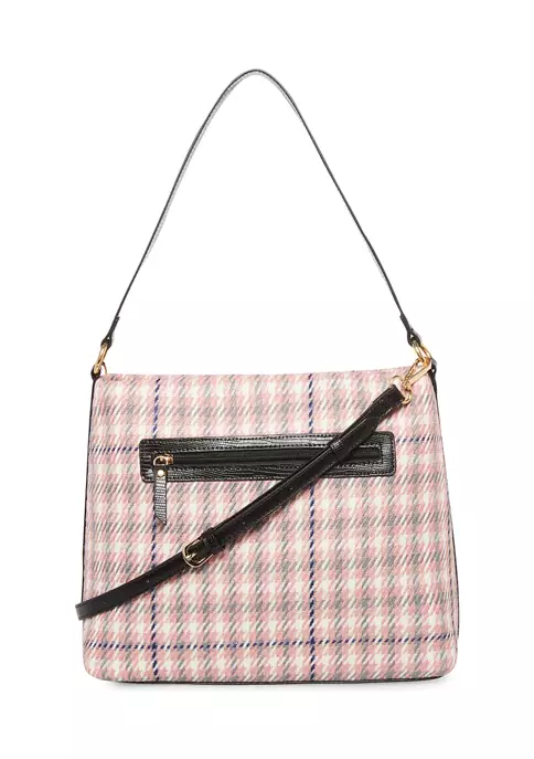 Complete with a removable card case, this hobo bag is enriched with a chic plaid print for added allure.