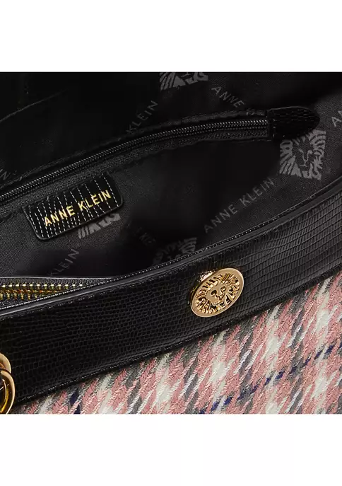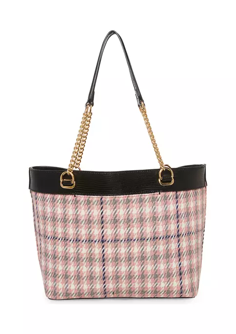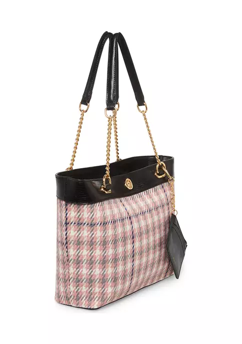 Covered in a posh plaid print, this tote from Anne Klein is complete with a removable pouch for added security.