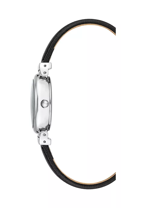 A black faux-leather band and silver-tone analog dial merge to form this sleek Anne Klein watch.