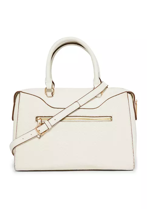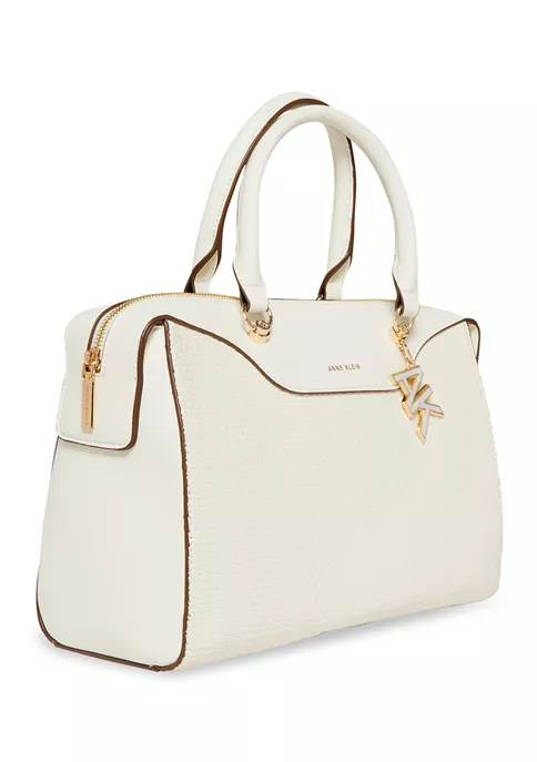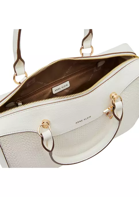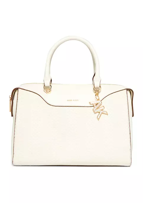 Woven for textural allure, this sleek satchel from Anne Klein is convenient with double top handles and a crossbody strap design.